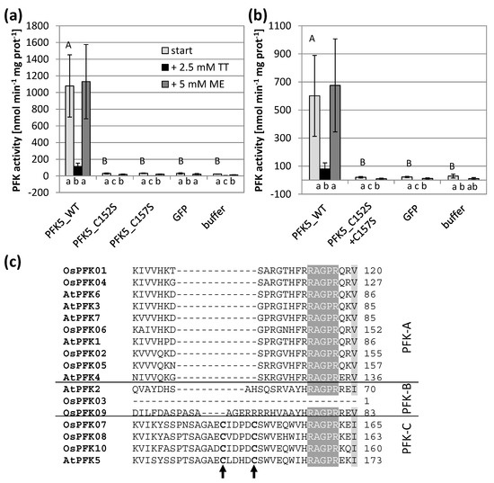 Impact of the CXDXXC motif on PFK activity and oxidation sensitivity. Single (a) and double (b) Cys to serine mutations were introduced in A. thaliana AtPFK5 proteins with CXDXXC motif. The variants were transiently overexpressed in tobacco leaves. Extraction buffer contained 5 mM β-mercaptoethanol (β-ME). After determining the initial activity, samples were oxidized with 2.5 mM sodium tetrathionate (TT) for 20 min and afterwards re-reduced with 5 mM dithiothreitol (DTT). Upper case letters show significant differences for each isoform to buffer control, lower case letters indicate significant differences among treatments for each protein at p < 0.05 (ANOVA, Post hoc Tukey test, n = 3). (c) Detail of the protein alignment of the CXDXXC motif in PFKs from A. thaliana and O. sativa. The two mutated Cys are marked with an arrow.