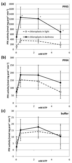 Inhibition of a plastid enzyme under reducing conditions might indicate an inhibition under physiological conditions in the light. We therefore used chloroplast suspensions from transiently transformed tobacco leaves that either expressed AtPFK5 or the other plastidic isoform AtPFK4, and kept them in either darkness or light for 1 h. In this experiment, the activity assay was performed with several ATP concentrations in order to exclude affinity differences for this substrate. Illumination of chloroplasts strongly inhibited AtPFK5 activity at either ATP concentration, while it had no significant effect on AtPFK4 or the native tobacco chloroplast PFK activity (Figure 6).