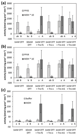 Thioredoxin-mediated inactivation of AtPFK5. Activities of PFK and NADP-MDH in extracts of tobacco leaves transiently overexpressing either AtPFK5 (a) or AtPFK4 (b), or mock controls (c). Crude leaf extracts were incubated with 1 and 10 mM DTT, or with 1 mM DTT and 5 µM (PFK) or 2.5 µM (MDH) of the respective TRX, and activity was measured after 30 min of incubation. Results are means ± SD of three independent infiltrations with three samples each. Upper case letters indicate significant differences among treatments for MDH, lower case letters indicate significant differences among treatments for PFK at p < 0.05 (ANOVA, Post hoc Tukey test). For comparability, MDH activity was multiplied by 10 (*) to be in the same range as PFK activity in (a,b).