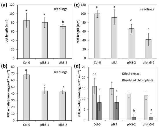 Analysis of two independent PFK5 T-DNA insertion mutants. (a) A. thaliana seedlings of pfk5-1 (Salk_067384) and pfk5-2 (Sail_694_A07) were grown under long-day conditions on solid 1/10 Hoagland medium together with the wildtype Col-0. After 14 days, root length was determined. Data represent means ± SD of 30 plants. Letters indicate significant differences at p < 0.05 (ANOVA, Post hoc Tukey test). (b) PFK activity of 14-day-old seedlings of Col-0, pfk5-1 and pfk5-2 grown on 1/10 Hoagland medium. Different letters indicate significant differences in protein activity at p < 0.05 (ANOVA, Post hoc Tukey test, n = 3–4). (c) Root length of 14-day-old seedlings, grown under long-day conditions on solid 1/10 Hoagland medium. Col-0 wildtype was compared to pfk5-2 (Sail_694_A07), pfk4-1 (SALK_012602) and the double mutant pfk5-2 pfk4-1. Data represent means ± SD of 3 independent experiments with 20 individuals each. Letters indicate significant differences at p < 0.05 (ANOVA, Post hoc Tukey test). (d) PFK activity in crude leaf extracts and isolated chloroplasts from 5-week-old rosette leaves of pfk4-1, pfk5-2 and the double mutant in comparison to wildtype Col-0. Data are means ± SD. Letters indicate significant differences among genotypes at p < 0.05 (ANOVA, Post hoc Tukey test, n = 4–6). n.s., not significant.