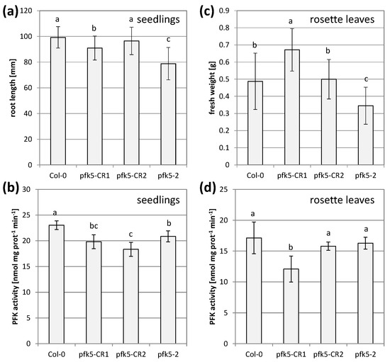 Analysis of two independent PFK5 CRISPR lines. (a) A. thaliana seedlings of pfk5-CR1 and pfk5-CR2 were grown under long-day conditions on solid 1/10 Hoagland medium together with pfk5-2 and the wildtype Col-0. After 14 days, root length was determined. Data represent means ± SD of 3 independent experiments with 20 individuals each. Letters indicate significant differences at p < 0.05 (ANOVA, Post hoc Tukey test). (b) PFK activity of 7-day-old seedlings of the four genotypes grown on MS medium. Different letters indicate significant differences in protein activity at p < 0.05 (ANOVA, Post hoc Tukey test, n = 5–6). (c) Rosette weight of 5-week-old plants of the four genotypes grown on soil. Data are means ± SD of 12 plants. Letters indicate significant differences at p < 0.05 (ANOVA, Post hoc Tukey test). Images of the plants are shown in Supplementary Figure S5. (d) PFK activity in crude leaf extracts from 5-week-old rosette leaves of the four genotypes. Data are means ± SD. Letters indicate significant differences among genotypes at p < 0.05 (ANOVA, Post hoc Tukey test, n = 4).