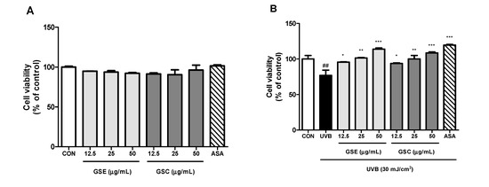 Hs68 (ATCC, CRL-1635, Manassas, VA, USA) cells were grown in DMEM containing 100 unit/mL penicillin, 10% heat-inactivated FBS, and 100 μg/mL streptomycin in 5% CO2 humidified air at 37 °C. The cells were seeded at a density of 1 × 104 cells/well in 96-well plates for 24 h and then pretreated with GSE, GSC, or ascorbic acid (ASA) for 24 h. The culture medium was changed with phosphate-buffered saline (PBS), and the cells were treated with 30 mJ/cm² UVB followed by additional 24 h incubation in FBS-free medium (DMEM containing 100 unit/mL penicillin and 100 μg/mL streptomycin) containing the same concentration of GSE, GSC, or ASA. An MTT assay was used to assess cell viability [32].