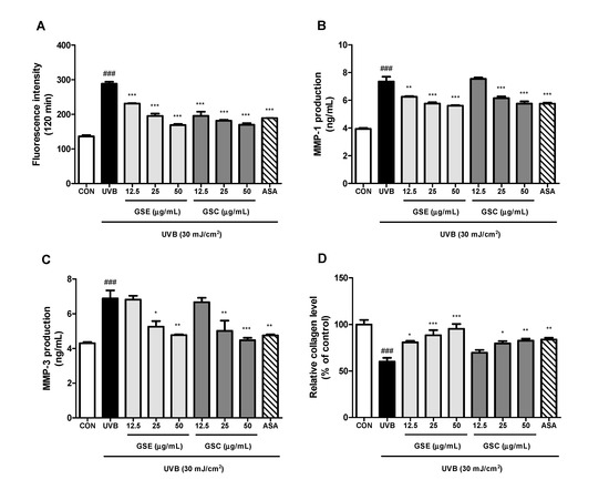 UVB induces the production of ROS, which damages cellular components. ROS triggers the expression of MMPs that enhance the degradation of ECM proteins, such as collagen [39]. ROS production was significantly higher in UVB-irradiated cells compared to control cells; however, the increased ROS production was attenuated in a concentration-dependent manner in UVB-irradiated cells treated with GSE and GSC extract (12.5–50 μg/mL) (Figure 2A). MMP-1 mainly degrades fibrillar collagens of the skin, whereas MMP-3 degrades a variety of ECM substrates and activates other secreted MMPs [39,40]. Production of MMP-1 (Figure 2B) and MMP-3 (Figure 2C) were significantly reduced in the GSE- and GSC-treated cells. In addition, GSE and GSC treatment restored collagen production in UVB-irradiated Hs68 cells compared with untreated UVB-irradiated cells in a concentration-dependent manner (Figure 2D). The extent of MMP inhibition and collagen regeneration at 50 μg/mL GSE and GSC treatment were similar to those of ascorbic acid as a positive control.