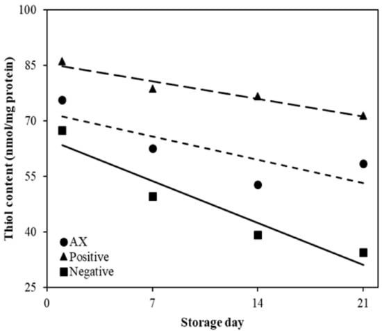 Linear regression was done to express the level of inhibition to loss of thiol (Table 4 and Figure 2). The slope values of the negative control, positive control, and AX from the linear regression coefficient of thiol content were −1.62, −0.90, and −0.68, respectively. The R2 of the negative control, positive control, and AX of thiol content were 0.73, 0.31, and 0.23, respectively. However, AX and the positive control were not observed to have significant differences in thiol content during storage periods (p > 0.05). Generally, the thiol group in protein is highly sensitive to oxidation in the existence of hydroperoxide, which is reduced by forming various compounds such as disulfide cross-link during the protein oxidation progress []. In addition, thiol content had significantly negative correlations with PV (correlation coefficient, −0.66; p < 0.001). Therefore, the reduction in thiol content could be affected by PV, and AX effectively inhibited the reduction of thiol content and the increase of PV during storage. Thus, AX was efficient in protein oxidation compared to the negative control.