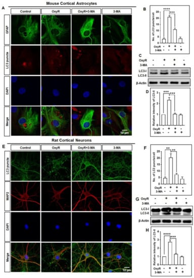 To elucidate the effects of OxyR on autophagy, we evaluated whether the autophagy inhibitor 3-methyladenine (3-MA), a well-recognized class III phosphatidylinositol 3-kinase (PI3K) inhibitor commonly used in autophagy inhibition [], regulated autophagy in cortical astrocytes. We found that OxyR caused significantly higher LC-3 puncta formation in cortical astrocytes. Particularly, treatment with both 3-MA and OxyR resulted in significantly lower numbers of LC-3 puncta, based on immunofluorescence assays (Figure 2A,B). Additionally, immunoblotting analysis showed that LC3-II protein expression was significantly higher in the presence of OxyR, significantly lower under OxyR + 3-MA co-treatment, and unchanged in the presence of 3-MA (Figure 2C,D). Furthermore, to confirm OxyR-mediated autophagy activity, we performed additional immunofluorescence and immunoblotting analyses using rat cortical primary neurons. These showed that OxyR treatment resulted in significantly more LC-3 puncta counts and higher LC3-II expression, and that 3-MA co-treatment significantly blocked OxyR-induced LC-3 puncta formation and LC3-II expression in rat cortical neurons (Figure 2E–H). Together, these results indicate that OxyR-mediated autophagy is dependent on the class III PI3K pathway in cortical astrocytes and neurons.