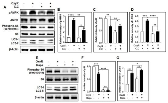 To understand the molecular mechanisms involved in autophagy activation induced by OxyR treatment, we assessed whether this polyphenolic compound regulated the expression of the autophagy initiation proteins AMPK and mTOR in astrocytes. AMPK has been found to initiate autophagy and maintain cellular energy and homeostasis [] in response to numerous cellular stresses []. In general, AMPK activates autophagy via inhibition of mTOR [], but the mechanism by which AMPK regulates autophagy remains elusive. We found that OxyR treatment caused significantly higher AMPK phosphorylation by upregulating LC3-II expression, as determined by immunoblotting analysis (Figure 3A,B). We also checked mTOR downstream phospho-S6 ribosomal protein (Ser240/244) (Figure 3A,C). However, co-treatment with OxyR and compound C [], an AMPK inhibitor, and OxyR caused significantly lower AMPK phosphorylation, with non-significantly decreased phospho-S6 (Figure 3A,C), and LC3-II expression (Figure 3A,D), indicating that AMPK controlled the OxyR-mediated autophagic pathway in cortical astrocytes. Additionally, we investigated whether autophagy was controlled by the mTOR pathway in cortical astrocytes. We found that the expression level of mTOR downstream phospho-S6 ribosomal protein (Ser240/244) was significantly lower in the OxyR-treated cells via higher expression of the autophagic marker LC3-II (Figure 3E,F). Meanwhile, co-treatment with the mTOR inhibitor rapamycin caused both significantly lower phospho-S6 ribosomal protein levels and upregulated LC3-II expression (Figure 3E,G), suggesting that mTOR was involved in OxyR-induced autophagy. Together, these results indicate that OxyR-mediated autophagy is dependent on the AMPK-mTOR pathway in mouse cortical astrocytes.