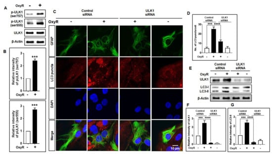 To determine whether the autophagy initiation protein complex ULK1 was involved in OxyR-induced autophagy in astrocytes, we determined the effects of OxyR in the presence of ULK1 siRNAs. We found that OxyR caused significantly higher phosphorylation of ULK1 (Ser757) and ULK1 (Ser555) in astrocytes (Figure 4A,B). Further UKL1 siRNA experiments were conducted to determine whether OxyR-mediated autophagy induction was dependent on the ULK1 pathway. Here, using immunocytochemical assays, we observed that under the treatment with control siRNAs, OxyR caused the formation of more LC3 puncta. However, ULK1 siRNA alone caused significantly lower OxyR-induced LC3 puncta formation in cortical astrocytes (Figure 4C,D). Moreover, immunoblotting analysis indicated that co-treatment of cells with OxyR and ULK1 siRNA resulted in significantly lower ULK1 and LC3-II expression levels in cortical astrocytes (Figure 4E–G). Together, these results indicate that ULK1 is an essential component of OxyR-mediated autophagy regulation in mouse cortical astrocytes.