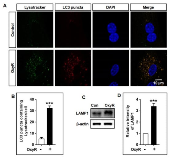 To complete the formation of the autophagolysosome, binding of the lysosome membrane proteins with autophagosomes and lysosomes is necessary []. Autophagolysosomes are damaged when lysosomal protein levels are spontaneously reduced or are selectively reduced during the fusion of autophagosome and lysosome []. To study whether lysosomes were associated with the occurrence of OxyR-mediated autophagy, we detected lysosomes using a green fluorescent lysosomal detection marker, LysoTracker, which labels and tracks the acidic organelles of living cells. We found that OxyR-treated cells exhibited significantly more LC3 puncta containing LysoTracker in cortical astrocytes using double immunofluorescence staining (Figure 5A,B). Additionally, to confirm the involvement of lysosomes which fused with autophagosomes, we examined lysosomal-associated membrane protein 1 (LAMP1) using immunoblotting analyses. Our results suggested that OxyR treatment significantly upregulated LAMP1 protein expression in cortical astrocytes (Figure 5C,D). Thus, this study indicates that OxyR-mediated autophagy stimulates lysosomal protein in mouse cortical astrocytes.