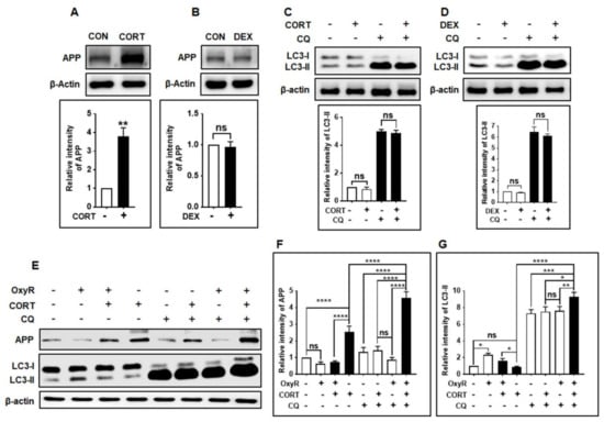 OxyR reduced APP production through the autophagy pathway. (A,B) Astrocytes were treated with 10 µM of CORT and DEX for 48 h. APP expression was determined by Western blotting. The intensity of the APP signal was measured by using ImageJ. (C,D) After conducting CORT and DEX treatments for 48 h, 10 µM CQ was added 2 h before harvest. The presence of LC3 was determined by Western blotting. (n = 3). (E) Astrocytes were treated with CORT for 48 h, and then with 10 µM OxyR for 24 h. CQ treatment (10 µM) was performed 2 h before cell harvest. The presence of APP and LC3 was determined by Western blotting. (F,G) Statistical analysis was performed. Data are presented as mean ± SEM. * p < 0.05, ** p < 0.01, *** p < 0.001, **** p < 0.0001, ns: non-significant. CON, control; CORT, corticosterone; DEX, dexamethasone; APP, amyloid precursor protein; CQ, chloroquine; LC3, microtubule-associated protein light chain 3.