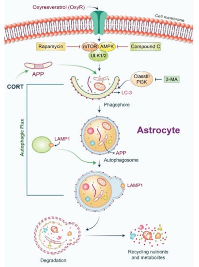 Model of OxyR-mediated APP reduction and autophagy induction in cortical astrocytes. OxyR initiates autophagy via stimulation of the AMPK/ULK1/mTOR pathway to activate phagophore formation and subsequently autophagosome maturation. CORT-initiated APP expression is followed by APP engulfment by autophagosomes. The lysosomal protein LAMP1 supports the binding of lysosomes with autophagosomes. Finally, APP is degraded by the autophagosome-lysosomal pathway, and the released nutrients and metabolites are recycled. AMPK, AMP-activated protein kinase; mTOR, mammalian target of rapamycin; ULK1, Unc-51-like autophagy activating kinase 1; APP, amyloid precursor protein; ClassIII PI3K, class III PI3-kinase; 3-MA, 3-methyladenine; LAMP1, lysosomal-associated membrane protein 1.