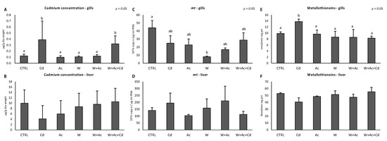 Cd concentration significantly increased in gills of organisms exposed to Cd, dosed alone or in combination with pH and temperature variations, showing values 3- to 5-fold higher than the control group (Figure 1A). On the contrary, no significant variations in Cd levels were observed in liver of fish exposed to Cd, alone and in combination with other factors (Figure 1B). Metallothioneins revealed a significant reduction of mRNA in gills of organisms exposed to temperature increase, while protein levels slightly increased in gills of Cd-exposed fish (Figure 1C,E). Conversely, no significant difference compared to control organisms was measured in livers of exposed organisms, neither for mRNA nor for proteins (Figure 1D,F).
