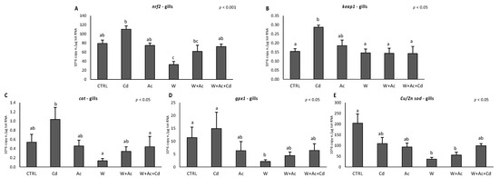 Transcriptional regulation of antioxidant responses was observed in gills. Both nrf2 and keap1 were significantly increased by Cd alone, while nrf2 significantly decreased in the warm condition (Figure 2A,B). Similar trends were observed for cat and gpx1, with an increase in Cd-exposed organisms and a certain decrease in organisms exposed to higher temperature (Figure 2C,D). Cu/Zn-sod decreased in all exposed organisms, with a statistically significant effect in organisms exposed to warm conditions (Figure 2E).
