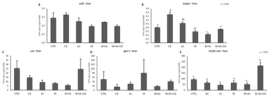 In the liver, no variation occurred for nrf2, while keap1 was enhanced by Cd alone and downregulated by co-exposure to higher temperature and reduced pH (Figure 3A,B). Cat showed a decreasing trend in organisms exposed to warming and acidification, alone or in combination (Figure 3C), while more fluctuating variations were observed for gpx1 after exposure to different conditions (Figure 3D). A marked upregulation of Cu/Zn-sod was measured only in organisms co-exposed to Cd in warm and acidified conditions (Figure 3E).