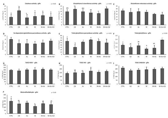 The antioxidant status was further assessed by functional analyses of various antioxidants integrated with the total capability to neutralize different forms of oxyradicals. Gills exhibited a decrease of total glutathione peroxidases activity after exposure to Cd alone, and total glutathione decreased in organisms exposed to warming and increased in fish co-exposed to all three stressors (Figure 4E,F). In addition, glutathione S-transferase activity under co-occurring warming and acidification was significantly enhanced by Cd (Figure 4B). The variations of individual antioxidants were not paralleled by any significant change in the TOSC values toward ROO●, HO● and ONOO●− (Figure 4G–I). Malondialdehyde content was reduced in gills after exposure to warm condition (Figure 4L).
