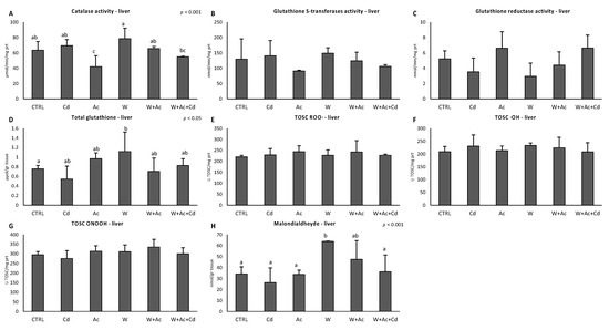 Responses of antioxidants were less evident in liver: catalase showed a slight but significant decrease only in organisms exposed to acidification, alone or in association with Cd and warming (Figure 5A). Temperature increase caused a significant enhancement of total glutathione content (Figure 5D), and no changes occurred for TOSC values (Figure 5E–G). A significant increase of malondialdehyde content was observed in liver of organisms exposed to the warm condition (Figure 5H).