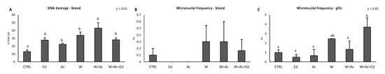 Validated protocols, detailed in Supplementary Material 1 (SM1), were applied for the analysis of the following biomarkers in both gills and livers: concentration of metallothioneins, activities of catalase, glutathione S-transferase, glutathione reductase, total glutathione concentration, total oxyradical scavenging capacity (TOSC) toward peroxyl and hydroxyl radicals and peroxynitrite (ROO●, HO●, ONOO−, respectively) and malondialdehyde levels. Glutathione peroxidases (both Se-dependent and total forms) were analyzed in both gills and livers, but in livers the high variability of obtained results, including those in the control group, caused unreliable responses and results were considered not suitable for publication. Genotoxic parameters (DNA fragmentation and micronuclei frequency) were analyzed in gills and blood.