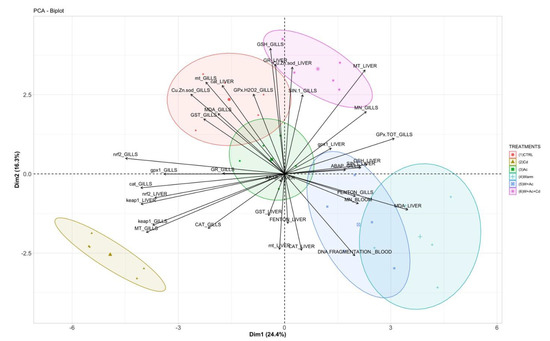 The principal components analysis on the whole biological parameters’ dataset produced a two-dimensional arrangement (Figure 7), explaining almost 41% of the total variance. A fair partitioning was observed among organisms exposed to Cd alone and all other treatments, and a further discrimination occurred between treatments of warming and acidification with and without Cd. This pattern was mainly determined along the PC1 axis by nrf2 and keap1 transcription both in liver and gills, metallothioneins levels and cat, gpx1 and Cu/Zn-sod transcription in gills; along the PC2 axis, the pattern was mostly determined by total glutathione in gills, metallothioneins levels and antioxidants in liver.