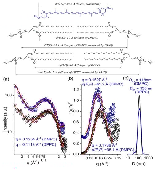 Top: Intramolecular dimensions of carotenoids and DMPC/DPPC bilayer as calculated by molecular mechanics [,]. The length of the carotenoid (lutein or zeaxanthin) corresponds to the length of the lipophilic segment of the DMPC phospholipid (double the average distance between the carbonyl group and the methyl group of the DMPC), and does not match the length of the lipophilic segment of the DPPC. Bottom: (a) SAXS data of DMPC-zeaxanthin (black) and DPPC-zeaxanthin (blue) LUVs; (b) Kratky plot from SAXS data, supporting the formation of unilamellar LUVs; and (c) Size distribution and the average diameter of DMPC-zeaxanthin (black) and DPPC-zeaxanthin (blue) LUVs measured by DLS (Figure S1).