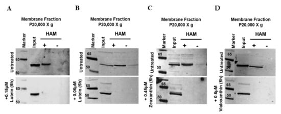 We previously established that mBCO2 in eukaryotic HEK293F cells is palmitoylated. We discovered that in the presence of the mBCO2 substrate β-carotene mBCO2 loses palmitoylation []. Knowing that BCO2 cleaves xanthophylls [,,] we decided to run palmitoylation assays to study the palmitoylation status of mBCO2 in the presence of xanthophylls. We first tried to deliver xanthophylls with the detergent Tween 40 []. We found that a higher concentration of Tween 40 (0.1%) led to HEK293F cell apoptosis as was previously described for HepG2 cells [], while a lower concentration (0.01%) eluted mBCO2 from membranes during the Acyl-RAC assay even without hydroxylamine treatment (data not shown). Therefore, we established a new method to deliver xanthophylls without detergents using unilamellar LUVs as described above. The content of xanthophylls in the HEK293F cells after 5 h of treatment was similar to a Tween 40 delivery system in ARPE-19 cells (1–2%) (Figure S2) []. Subsequently, we used the acyl-RAC method as described previously. The membrane fraction of HEK293F cells expressing mBCO2 was subjected to treatment with hydroxylamine (+HAM) and an equal portion of the fraction was treated with 250 mM NaCl (−HAM) which served as control. In the absence of substrates, mBCO2 protein showed an intense protein band in the HAM-treated sample (Figure 2A–D untreated panels, full Western blots are presented in Figure S3), while there was no protein band in the control NaCl-treated sample, indicating S-palmitoylation of BCO2 protein. In contrast, when cells were pre-treated with 0.15 µM lutein and 0.06 µM in DMPC/DMPS micelles, no protein band was detected in the HAM-treated sample (Figure 2A,B and Figure S3A,D, lutein panel). Similar results were obtained with DPPC/DPPS-encapsulated zeaxanthin (0.45 µM) (Figure 2C and Figure S3B) and DMPC/DMPS-encapsulated violaxanthin (0.6 µM) (Figure 2D and Figure S3C).