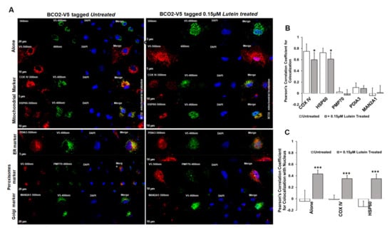 Characterization of subcellular localization of mBCO2 treated with lutein. (A) COS7 cells expressing mBCO2 protein treated with 0.15 μM lutein for 5 h were immunoassayed using antibodies against V5 tag and different organelle marker proteins as indicated in the Materials and Methods section. Pearson’s correlation coefficient for colocalization of V5-tagged mBCO2 protein with different organellar marker proteins (B) and with nucleus (C); * p ≤ 0.05; *** p ≤ 0.0005.