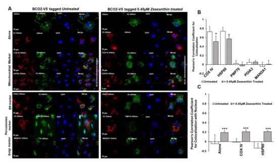 Characterization of subcellular localization of mBCO2 treated with zeaxanthin. (A) COS7 cells expressing V5-tagged mouse BCO2 protein treated with 0.45 μM zeaxanthin for 5 h were immunoassayed using antibodies against V5 tag and different organelle marker proteins as indicated in the Materials and Methods section. Pearson’s correlation coefficient s were calculated for colocalization of V5-tagged mBCO2 protein with different organellar marker proteins (B) and with nucleus (C); * p ≤ 0.05; *** p ≤ 0.0005.