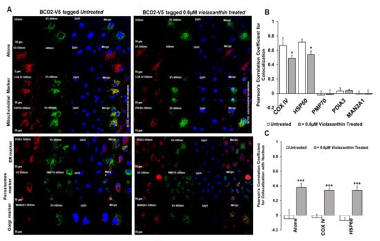 Characterization of subcellular localization of mBCO2 treated with violaxanthin. (A) COS7 cells expressing mBCO2 protein treated with 0.6 μM violaxanthin for 5 h were immunoassayed using antibodies against V5 tag and different organelle marker proteins as indicated in the Materials and Methods section. Pearson’s correlation coefficients were calculated for colocalization of V5-tagged mBCO2 protein with different organellar marker proteins (B) and with nucleus (C); * p ≤ 0.05; *** p ≤ 0.0005.