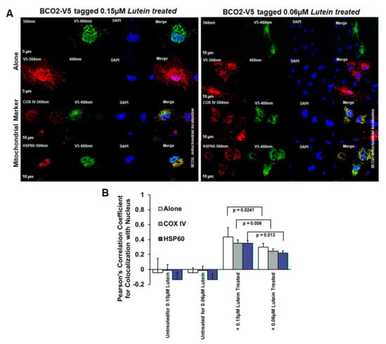 (A) Cellular Localization of V5-tagged mouse BCO2 with and without lutein: mBCO2 with and without 0.15 µM lutein; (left panel) mBCO2 with and without 0.06 µM lutein; (right panel). Pearson’s correlation coefficients were calculated for colocalization of V5-tagged mBCO2 protein with nucleus (B).