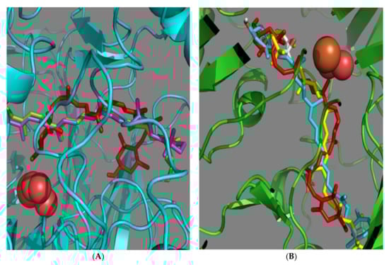 Visualization of carotenoid docking (A) on the mBCO2 protein I-TASSER model (lutein in green and β-carotene in purple, zeaxanthin in red and protein in cyan) and (B) on the mBCO2 protein Swiss-Model model (violaxanthin in yellow, lutein in cyan, zeaxanthin in red and protein in green).