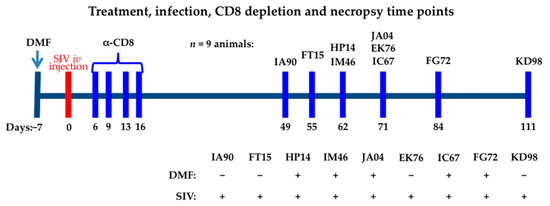 Schedule for dimethyl fumarate (DMF) treatment, anti-CD8 antibody treatments, simian immunodeficiency virus (SIV) inoculation, and necropsies of rhesus macaques. DMF treatment (90 mg total DMF daily, 5 animals DMF-treated, 4 untreated) was initiated seven days prior to the SIV infection, which was considered to be day “0.” On day “0” all animals (9 rhesus macaques) were intravenously infected with 100 TCID50 (50% tissue culture infectious dose) SIVmac251. CD8+ T lymphocyte depletion was achieved via treatment with anti-CD8 antibody infusions from 6 to 16 days post infection (dpi) via subcutaneous administration (10 mg/kg for the first dose and then subsequent doses at 5 mg/kg. Necropsies were performed at the indicated dpi thereafter. Individual animals are identified by unique letter–number combinations.