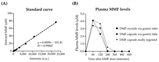 Plasma monomethyl fumarate (MMF) levels in rhesus macaques after a single enteral dose of DMF (30 mg). (A) An eight-point standard curve was prepared using serial dilutions (MMF concentrations from 77 to 0.6 μM). MMF was reconstituted in macaque plasma, which was previously separated from untreated rhesus macaque blood, and detected using liquid chromatography–mass spectrometry. (B) Each of three adult male rhesus macaques (8.1 kg, 9.1 kg, 11.4 kg) received a single 30 mg dose of DMF admixed in methylcellulose, either as a gelatin-coated capsule or as a crystalline suspension. One animal received the DMF capsule via a gastric tube. One animal received 30 mg of DMF embedded in a foodstuff, which was orally ingested. The remaining animal received a suspension of DMF crystals via a gastric tube. Plasma was separated from whole blood drawn at each indicated time point after the DMF administration. Samples were extracted with acetonitrile, dried, and reconstituted in acetonitrile solution. Each sample was assayed using LC–MS to establish the MMF content. Standard curves were prepared using monomethyl fumarate-13C-D3 for calibration.