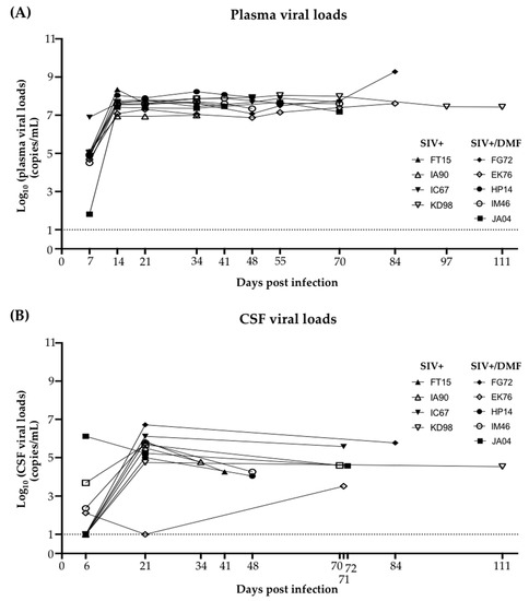 SIV RNA was detectable in plasma from all animals after 7 dpi and in cerebrospinal fluid (CSF) at the necropsy time points. (A) SIV plasma viral loads (RNA copies/mL) from each animal. SIV RNA was detectable from 7 dpi until the necropsy day. (B) The SIV CSF viral loads (RNA copies/mL) from each animal. SIV RNA was detectable in one animal at 6 dpi. One animal did not have detectable CSF SIV RNA until the necropsy day. Nine rhesus macaques, all SIV-infected, were used in the study (4 untreated animals and 5 DMF-treated (90 mg total DMF daily)). Each dot represents the value for each animal at each time point. Individual animals are listed by unique letter–number combinations.