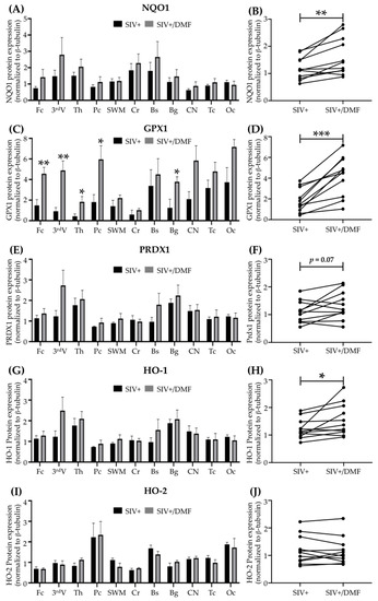 DMF treatment was associated with higher antioxidant enzyme expression in the brains of SIV-infected macaques. (A) No significant difference in NQO1 expression was observed in the individual regions using Student’s unpaired t-test (Fc: frontal cortex, 3rdV: third ventriculi, Th: thalamus, Pc: parietal cortex, SWM: subcortical white matter, Cr: cerebellum, Bs: brainstem, Bg: basal ganglia, CN: caudate nuclei, Tc: temporal cortex, Oc: occipital cortex). (B) A significant increase in overall mean NQO1 expression was observed with DMF treatment (paired t-test). (C) A significant increase in GPX1 expression was observed in the Fc, 3rdV, Th, Pc, and Bg with DMF treatment. (D) A significant increase in overall mean GPX1 expression was observed with DMF treatment. (E) No significant difference in PRDX1 expression was observed in individual regions. (F) A statistically non-significant (p = 0.07) increase in the overall mean PRDX1 expression was observed with DMF treatment. (G) No significant difference in HO-1 expression was observed in individual regions. (H) A significant increase in overall mean HO-1 expression was observed with DMF treatment. (I,J) No significant difference in HO-2 expression was observed in individual regions or overall in the brains with DMF treatment. Differences in expression within individual brain regions between both groups (DMF-treated and untreated) were evaluated using Student’s unpaired t-test and comparison between the mean of the expression for each enzyme in each group was done using Student’s paired t-test (* p < 0.05, ** p < 0.01, *** p < 0.001). Nine SIV-infected rhesus macaques (4 untreated animals and 5 DMF-treated (90 mg total DMF daily)). All quantifications are expressed as mean ± standard error of the mean (SEM). In the right panels, each dot represents the average for each region and group.