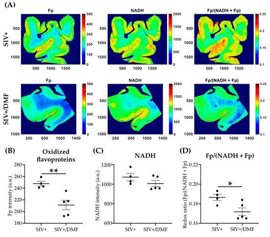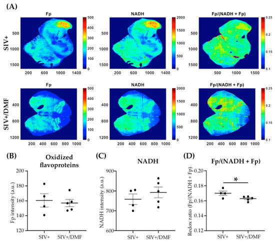DMF treatment was associated with a lower redox ratio Fp/(NADH + Fp) in the brainstem of SIV-infected macaques. (A) Representative images (brainstem) of the autofluorescence of Fp (left), NADH (center), and Fp/(NADH + Fp) (right). The “x” and “y” coordinates of the image matrices are shown. Numbers and color bars on the right of each image indicate the range of the redox index being displayed. (B) Quantification of the Fp autofluorescence showed no significant change in Fp levels with DMF treatment (statistical analysis was done with Student’s unpaired t-test). (C) No significant difference in NADH levels was observed with DMF treatment. (D) Quantification of Fp/(NADH + Fp) showed that the DMF treatment was associated with a lower redox ratio, which was indicative of a lower oxidative stress level (statistical analysis was done with Student’s unpaired t-test, * p < 0.05). Nine SIV-infected rhesus macaques were used in the study (four untreated animals and five DMF-treated (90 mg total DMF daily)). Intensities are in arbitrary units (a.u.) and all redox indices are expressed as the mean ± SEM.