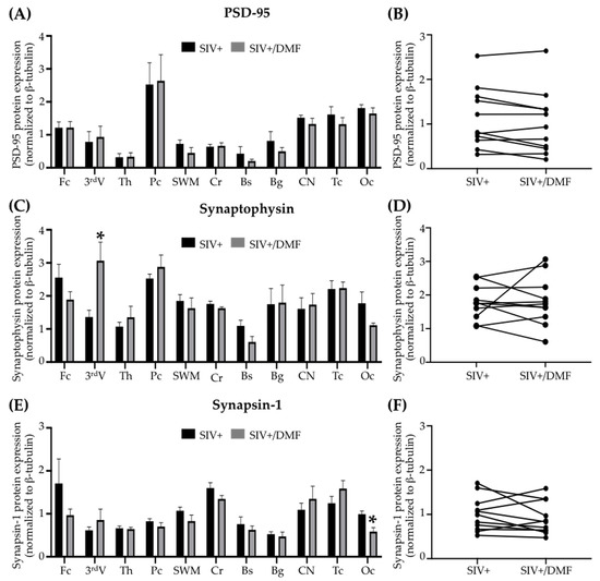 DMF treatment was associated with limited regional changes in expression of the synaptic proteins synaptophysin and synapsin I, but not PSD-95, in the brains of SIV-infected macaques. (A,B) No significant differences in PSD-95 (post-synaptic protein) expression were observed in individual regions or overall in the brains with DMF treatment. (C) A significant increase in synaptophysin (pre-synaptic protein) expression was observed in the third ventricle (Student’s unpaired t-test, * p < 0.05) but without a difference in the overall mean brain expression (D) with DMF treatment. (E) A significant decrease in synapsin 1 (pre-synaptic protein) expression was observed in the occipital cortex (Student’s unpaired t-test, * p < 0.05) but without a difference in the overall mean brain expression (F) with DMF treatment. Eleven brain regions from nine SIV-infected rhesus macaques (4 untreated animals and 5 DMF-treated (90 mg total DMF daily)) were analyzed using Western blotting. In the right panels, each dot represents the mean expression of one brain region from all animals in the group. Fc: frontal cortex, 3rdV: third ventricle, Th: thalamus, Pc: parietal cortex, SWM: subcortical white matter, Cr: cerebellum, Bs: brainstem, Bg: basal ganglia, CN: caudate nuclei, Tc: temporal cortex, Oc: occipital cortex. All values are expressed as mean ± SEM.