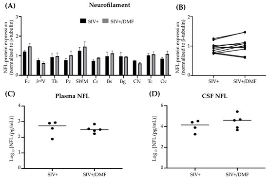 DMF treatment was not associated with changes in NFL. (A,B) NFL in the brain tissue, as determined using Western blot. Eleven brain regions from 9 SIV-infected rhesus macaques (4 untreated animals and 5 DMF-treated (90 mg total DMF daily)) were analyzed. In panel (B), each dot represents the mean average for each region and group. (C) The plasma and (D) cerebrospinal fluid (CSF) NFL did not change with the DMF treatment. NFL was quantified using a Singleplex Assay (Meso Scale Discovery, Rockville, MD, USA). Each dot represents the NFL value for each animal. Fc: frontal cortex, 3rdV: third ventricle, Th: thalamus, Pc: parietal cortex, SWM: subcortical white matter, Cr: cerebellum, Bs: brainstem, Bg: basal ganglia, CN: caudate nuclei, Tc: temporal cortex, Oc: occipital cortex. All values are expressed as mean ± SEM.
