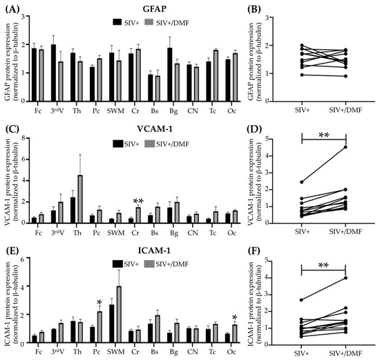DMF treatment was associated with higher VCAM-1 and ICAM-1 expression in the brains of SIV-infected macaques. (A,B) No significant differences in the GFAP expression were observed in individual regions or overall in the brains with DMF treatment. (C) A significant increase in VCAM-1 expression in the cerebellum (Student’s unpaired t-test, ** p < 0.01) and in the overall mean expression (D) with DMF treatment (Student’s paired t-test, ** p < 0.01). (E) A significant increase in the ICAM-1 expression in the parietal and occipital cortexes (Student’s unpaired t-test, * p < 0.05) and in the overall mean expression (F) with DMF treatment (Student’s paired t-test, ** p < 0.01). Eleven brain regions from 9 SIV-infected rhesus macaques (4 untreated animals and 5 DMF-treated (90 mg total DMF daily)) were analyzed using Western blotting. In the right panels, each dot represents the mean expression of one brain region from all animals in the group. Fc: frontal cortex, 3rdV: third ventricle, Th: thalamus, Pc: parietal cortex, SWM: subcortical white matter, Cr: cerebellum, Bs: brainstem, Bg: basal ganglia, CN: caudate nuclei, Tc: temporal cortex, Oc: occipital cortex. All values are expressed as mean ± SEM.