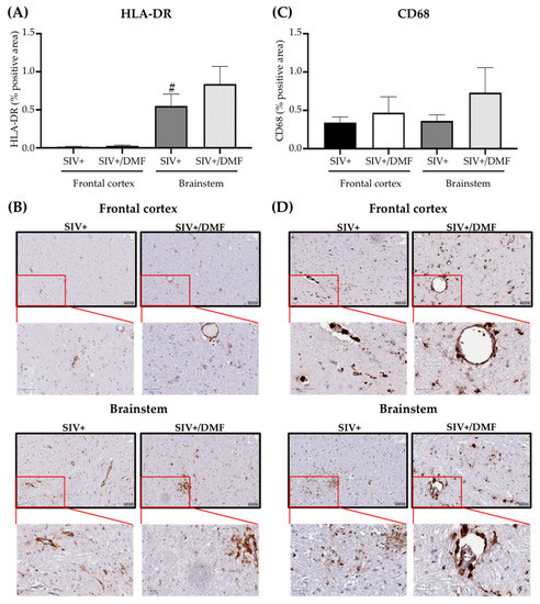 DMF treatment was not associated with the altered brain expression of HLA-DR (monocyte/microglia activation) or CD68 (monocyte marker). (A) Quantification of HLA-DR in the frontal cortex and brainstem. The brainstem showed a higher expression of HLA-DR than the frontal cortex (statistical analysis was done with Student’s unpaired t-test, # p < 0.05 comparing the frontal cortex vs. the brainstem in the SIV+ group) and the DMF treatment showed no effect on the HLA-DR expression. (B) Representative labeling for HLA-DR in the frontal cortex (top panels) and brainstem (bottom panels). (C) Quantification of CD68 in the frontal cortex and brainstem. The DMF treatment showed no effect on the CD68 expression. (D) Representative labeling for CD68 in the frontal cortex (top panels) and brainstem (bottom panels). Four contiguous sections from each region were harvested from each animal for labeling with each antibody. Nine SIV-infected rhesus macaques were used in the study (4 untreated animals and 5 DMF-treated (90 mg total DMF daily)). Images from all sections were taken using a digital slide scanner (Aperio AT2, Leica Biosystem, Wetzlar, Germany) at 20× magnification and were analyzed with QuPath software (version 0.2.0-m5), as previously reported [46]. Quantifications are expressed as the mean percent of positive staining from all the stained areas ± SEM.