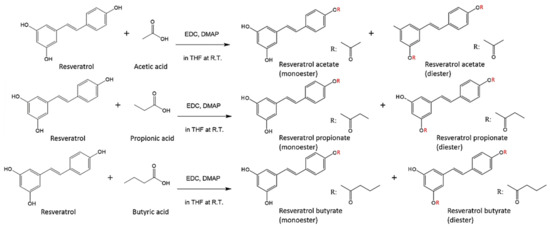 Reactions for the synthesis of resveratrol esters. EDC, 1-ethyl-3-(3-dimethylaminopropyl) carbodiimide; DMAP, 4-dimethylaminopyridine; THF, tetrahydrofuran; R.T., room temperature (28–30 °C).