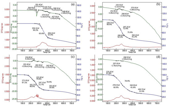 Thermograms of (a) pristine resveratrol (RE) and the products of the esterification of RE with (b) acetic, (c) propionic, and (d) butyric acids obtained under a nitrogen flow in the temperature range of 50–750 °C.