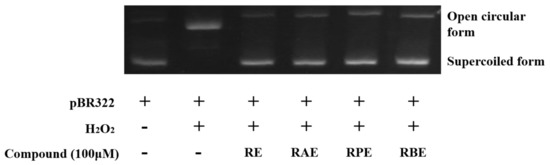 Inhibition of hydroxyl radical-induced DNA scission. Here, RE, RAE, RPE, and RBE denote resveratrol, resveratrol acetate, respectively.