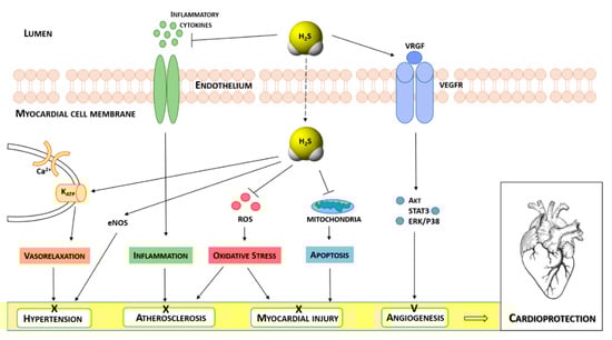 Currently, growing research evidence has confirmed the protective effects of H2S in cardiovascular diseases [16,17,18,19,20,21,22,23], such as cardiac hypertrophy, heart failure, myocardial ischemia/reperfusion (I/R) injury [24], hypertension [18,25] and atherosclerosis [26], acting as an activator of angiogenesis [27], basal vasorelaxant agent [28], blood pressure, and heart rate regulator [29,30]. Moreover, it has been demonstrated that the related mechanisms of action accounting for this cardioprotective activity involve antioxidation, inhibition of cell apoptosis, pro-angiogenesis, anti-inflammatory, and ion channels regulation [31,32] (Figure 1).