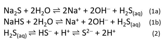 In water or aqueous solution, these sulfide salts quickly hydrolyze, establishing a dynamic equilibrium among sulfide ions (S2−), bisulfide ions (HS−), and molecular hydrogen sulfide (H2S) [77] (Figure 2); the ratio of these species depends on different parameters, such as temperature, pressure, and pH.