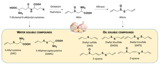 So far, among garlic-derived compounds, allicin is one of the best characterized. Due to its instability in aqueous media, it quickly decomposes into four H2S-releasing compounds: diallyl sulfide (DAS), diallyl disulfide (DADS), diallyl trisulfide (DATS), and ajoene [43].