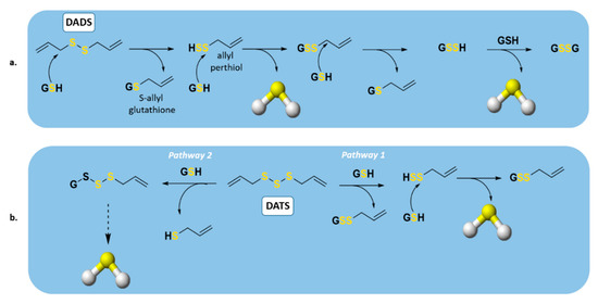 Among the oil-soluble components of garlic, the major organosulfur compounds were reported to be DADS and DATS. In 2007, Benavides et al. demonstrated that these compounds could release H2S rapidly through a thiol-dependent mechanism [93] (Figure 5). In the presence of GSH, DADS can react with it to generate S-allyl glutathione (GSA) and the intermediate allyl perthiol (ASSH), which reacts with another GSH to produce H2S and S-allyl glutathione disulfide (GSSA). Furthermore, the latter compound could also undergo α-carbon nucleophilic substitution, generating H2S rapidly [78] (Figure 5a). This mechanism has been widely confirmed [33,94,95,96,97,98,99], except for the rate of H2S release from DADS. Regarding this topic, in fact, Liang and co-workers demonstrated that DADS releases H2S very slowly through α-carbon nucleophilic substitution. The explanation of the previous misunderstanding of DADS as a fast H2S donor is DATS contamination in commercial samples of DADS; in fact, among these compounds, DATS is responsible for the rapid H2S release.