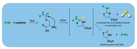 The formed Cys-ITC adduct undergo intramolecular cyclization followed by releasing organic amine R−NH2 and raphanusamic acid (RA), on one hand, and H2S and 2-carbylamino-4,5-dihydrothiazole-4-carboxylic acid, on the other hand [101].