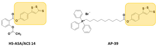 They are usually synthesized by coupling the active compounds with ADT-OH in the presence of N,N’-dicyclohexylcarbodiimide (DCC) and 4-dimethylaminopyridine (DMAP) (Figure S8) [119]. These H2S donor hybrids exhibited their efficacy in many pharmacological fields, such as inflammation [120,121] (H2S-donating diclofenac, ACS-15/ATB-337; H2S-donating mesalamine, ATB-429), cancer [122] (H2S-donating sulindac, HS-SUL; H2S-donating aspirin, HS-ASA/ACS-14; H2S-donating ibuprofen, HS-IBU; H2S-donating naproxen, HS-NAP), erectile dysfunction [123] (H2S-donating sildenafil, ACS 6), neurodegeneration (H2S-donating latanoprost, ACS 67, for glaucoma treatment [124], and H2S-donating levodopa, ACS 83, for Parkinson’s disease [125]), and cardioprotection (H2S-donating aspirin, HS-ASA/ACS 14, and AP-39) (Figure 7).