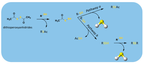 Regarding DATS (Figure 5b), two possible thiol−disulfide exchange reaction pathways can occur. Firstly (pathway 1), the nucleophilic attack of GSH on allylic sulfur of DATS can generate GSSA and ASSH, with the latter able to be reduced by GSH and thus releasing H2S; on the other side (pathway 2), the nucleophilic attack of GSH on the central sulfur atom of DATS can lead to the production of ASH and GSSSA. The latter can generate H2S rapidly.