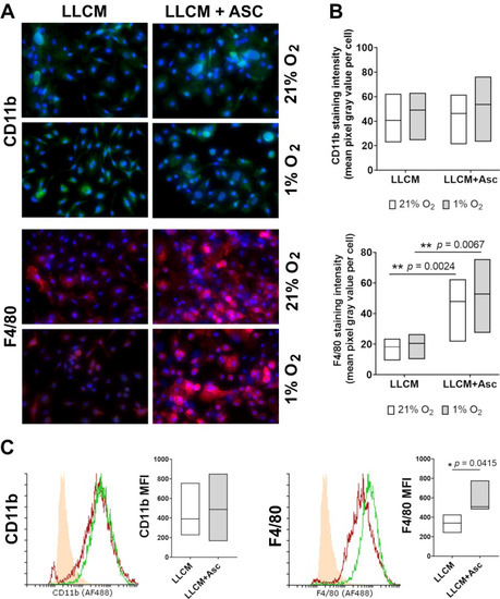 Here, we also found cells grown in LLCM + Asc to have higher F4/80 staining intensity compared to LLCM only. Microscopic evaluation of immunostained cells showed higher average F4/80 staining per cell in the LLCM + Asc group for both oxygen tensions, but no change in CD11b staining (Figure 1B). Flow cytometric analysis supported this finding, with the LLCM + Asc BMDMs showing increased mean fluorescent intensity compared to the LLCM BMDMs (Figure 1C).