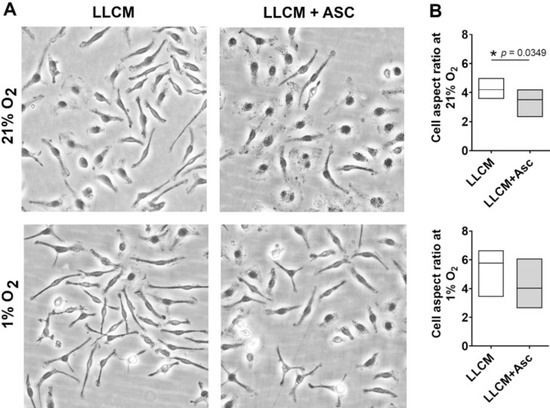 Isolation and growth of BMDMs essentially relies on the adherent nature of monocytes to culture surfaces (plastic or glass) as well as continued survival and growth in the presence of specific growth factors such as MCSF. These conditions typically yield a purity of more than 90% after prolonged culture [46]. We found 40% LLCM supplemented media capable of supporting bone marrow cell adherence upon isolation and subsequent growth, while 10% and 20% LLCM supplementation was inadequate according to microscopic observations (data not shown). LLCM grown BMDMs at 21% O2 with or without ascorbate, resembled a mix of spindle shaped and spread-out cells (Figure 3A). These cells tolerated the switch from 21% O2 to 1% O2 (hypoxia) at day 6 for a period of ~18 h with no signs of cell attrition. However, after ~18 h of culture under hypoxia, LLCM grown BMDMs with or without ascorbate developed a more pronounced spindle shape with thinner and more elongated cell bodies. Ascorbate supplementation at 500 µM did not affect cell adherence, viability or growth. However, ascorbate supplemented LLCM grown cells were less spindled compared to LLCM-only cultured cells under both 21% and 1% O2 (Figure 3). Morphometric analysis supported visual observations although significant change was only found in cells grown under 21% O2 (Figure 3B).