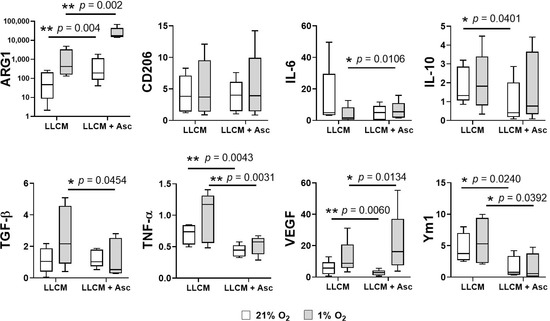 Ascorbate supplementation in LLCM grown BMDMs further altered gene expression (right columns in Figure 4). At both oxygen tensions, there was a significant decrease in Tnf-α and Ym1 expression in the presence of ascorbate, while Arg1 showed a significant increase. Interestingly, ascorbate supplementation resulted in a significant decrease of Vegfa expression at 21% O2, but a significant increase at 1% O2. There were also other significant ascorbate-mediated gene expression changes that were observed only at specific oxygen tension; decrease in Il-10 and Tgf-β at 21% O2 and 1% O2, respectively, and increase in Il-6 at 1% O2.